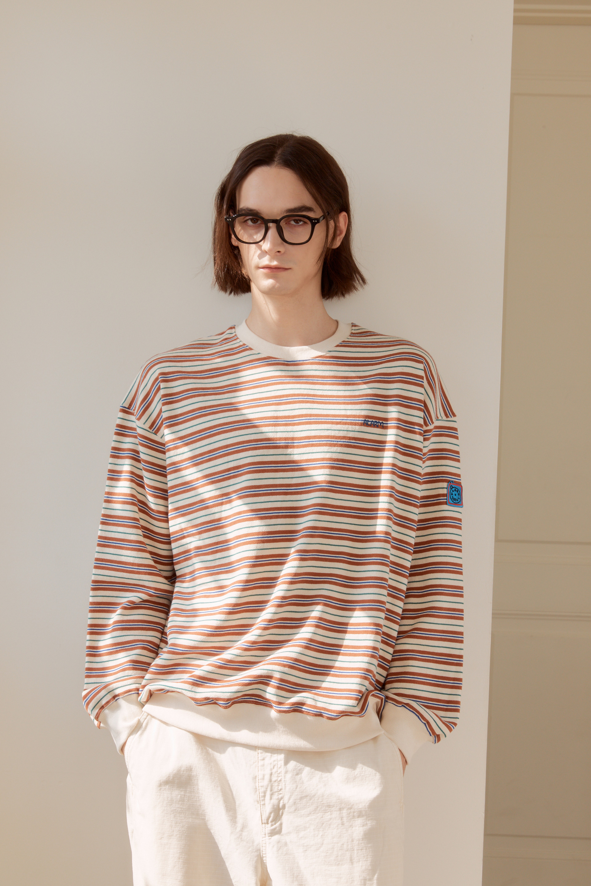 아이보리에 3가지 컬러로 스트라이프 무늬가 들어가 있는 스웻셔츠입니다.