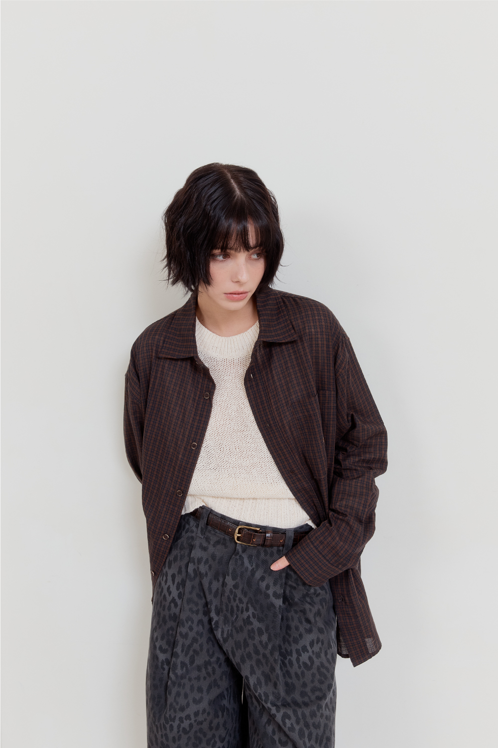 은은한 비침이 느껴지는 시스루한 텍스처의 소재로 브라운과 네이비 컬러의 체크 패턴의 소재입니다.